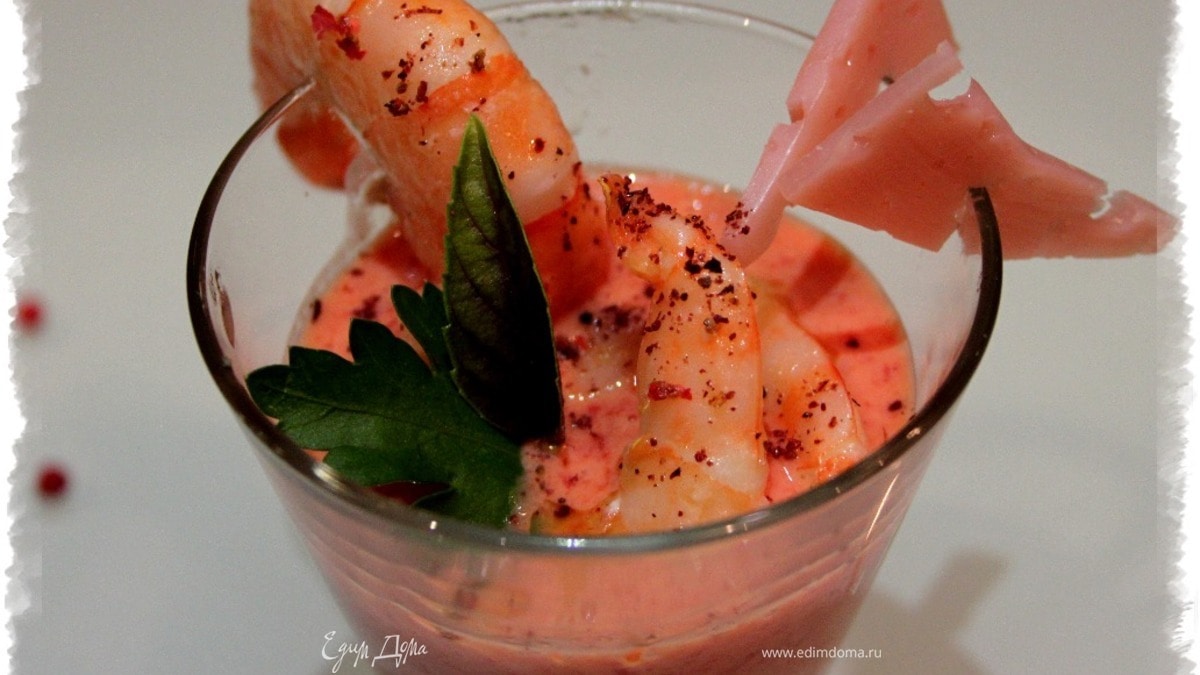 Готовый соус выложить в красивый бокал или креманку. Несколько креветок погрузить соус. Украсить край бокала креветкой и ломтиками сыра "Чайная роза". Посыпать измельченным розовым перцем или сумахом. Украсить зеленью петрушки и листиком базилика.