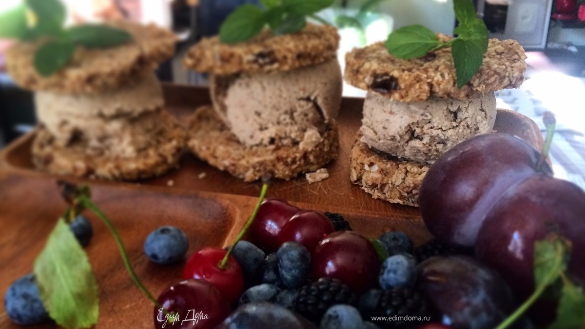Далее соединяем карамель с кокосовым кремом и, как с обычным мороженым, в охлажденную посуду, морозим, вынимаем каждые 30-40 мин, мешаем раза 3-4. Или в машинку для мороженного. Я еще люблю в этот пломбир на последней стадии работы машинки (или на последнем ручном перемешивании) вводить 2-3 ложки кокосовой стружки, которая осталась от печений. Текстура мороженного становится интереснее. И погнали собирать всевозможные вариации на тему сэндвичей, бутербродов и т.д. У меня тут в виде украшения виден "шоколад", это просто более густая версия карамели с большим количеством фиников и с добавлением какао. Это другая партия сэндвичей:)