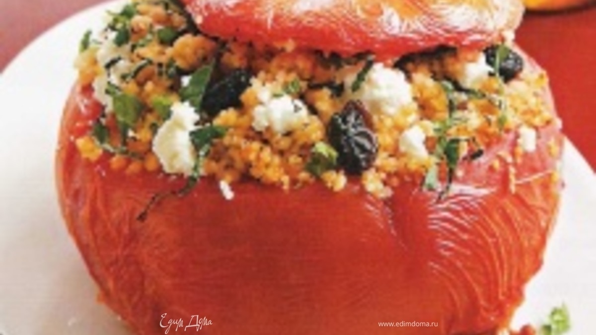 - Шаг 2Смешать пшенку с томатным соусом, изюмом, фетой, мятой и начинить смесью помидоры. Затем выставить их на смазанный сливочным маслом противень и запекать 25 минут в духовке при средней температуре.