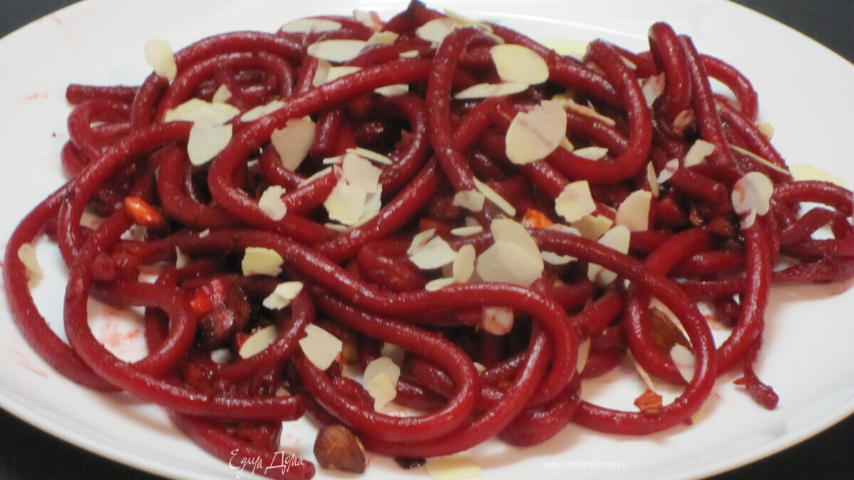 Необычное сочетание продуктов: паста, орехи и свежевыжатый свекольный сок. Получилось очень приятное по вкусу блюдо. Сок свеклы придал