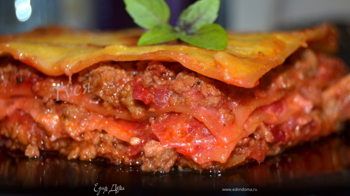 Выкладываем в жаропрочную посуду листы лазаньи,затем соус и сверху мясной фарш.Так повторяем несколько слоев.Верхний слой покрываем соусом и посыпаем тертым сыром.Закрываем форму фольгой. - Шаг 9