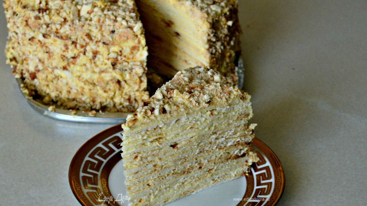- Шаг 14Промазать каждый корж кремом, верх и бока. Обсыпать крошкой.