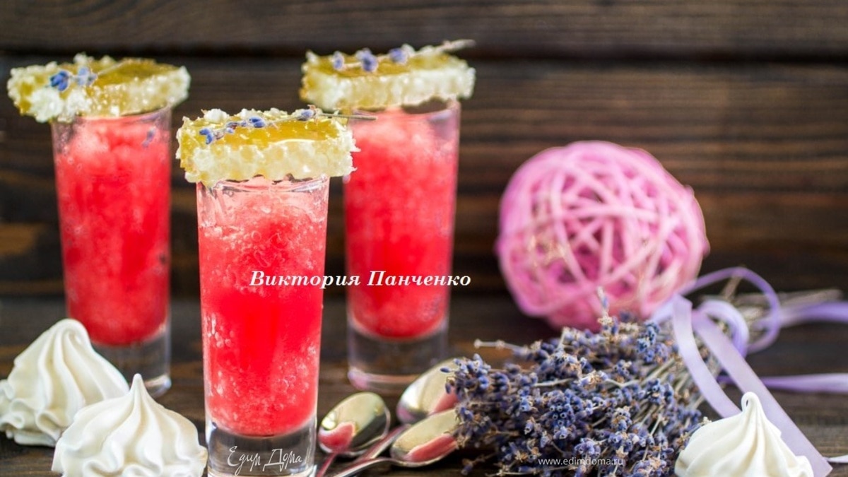 - Шаг 2Добавить в арбузное пюре сок и цедру лимона, белый ром, жидкий мед и цветки лаванды. Все хорошо перемешать.