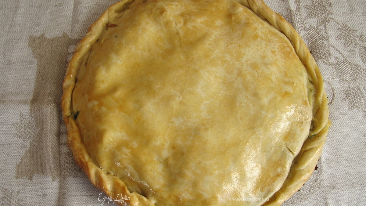 Раскатать вторую часть теста и укрыть им начинку. Защипнуть края. Смазать пирог оставшимся желтком и поставить в предварительно разогретую до 180C духовку на 1 час. Время выпечки может отличаться, все зависит от вашей духовки. Пирог готов, когда покроется румяной корочкой. - Шаг 7
