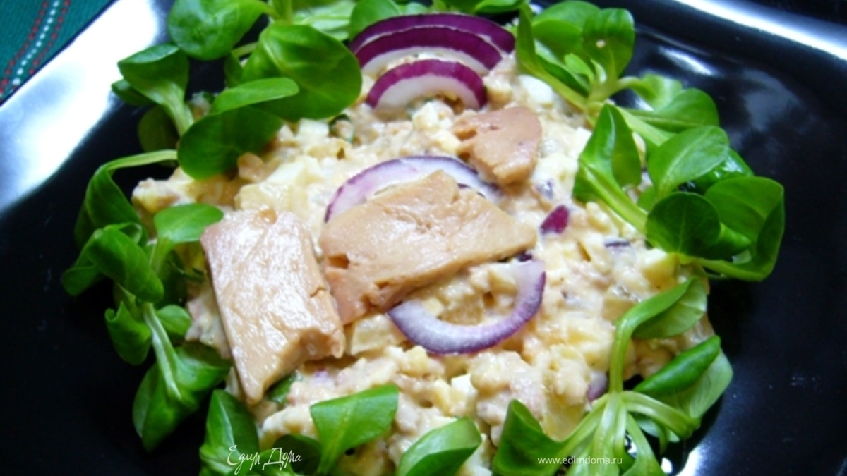 Печень трески аккуратно достать из банки и обсушить на бумажном полотенце. Измельчить.