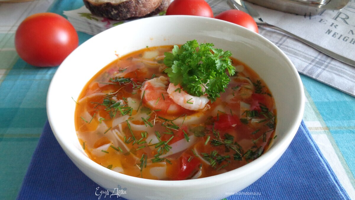 Хочу предложить вашему вниманию очень вкусный, насыщенный суп с морепродуктами и рыбой, с добавлением томатов, овощей и рисовой лапшой.