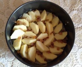 Форму проложить пергаментом и смазать сливочным маслом, разложить порезанные на четверть яблоки, изюм, присыпать ванильным сахаром. Таким образом яблоки немного карамелизируются.