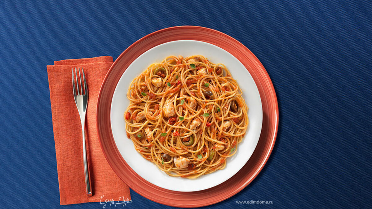 Спагетти с оливковым соусом и куриным филе