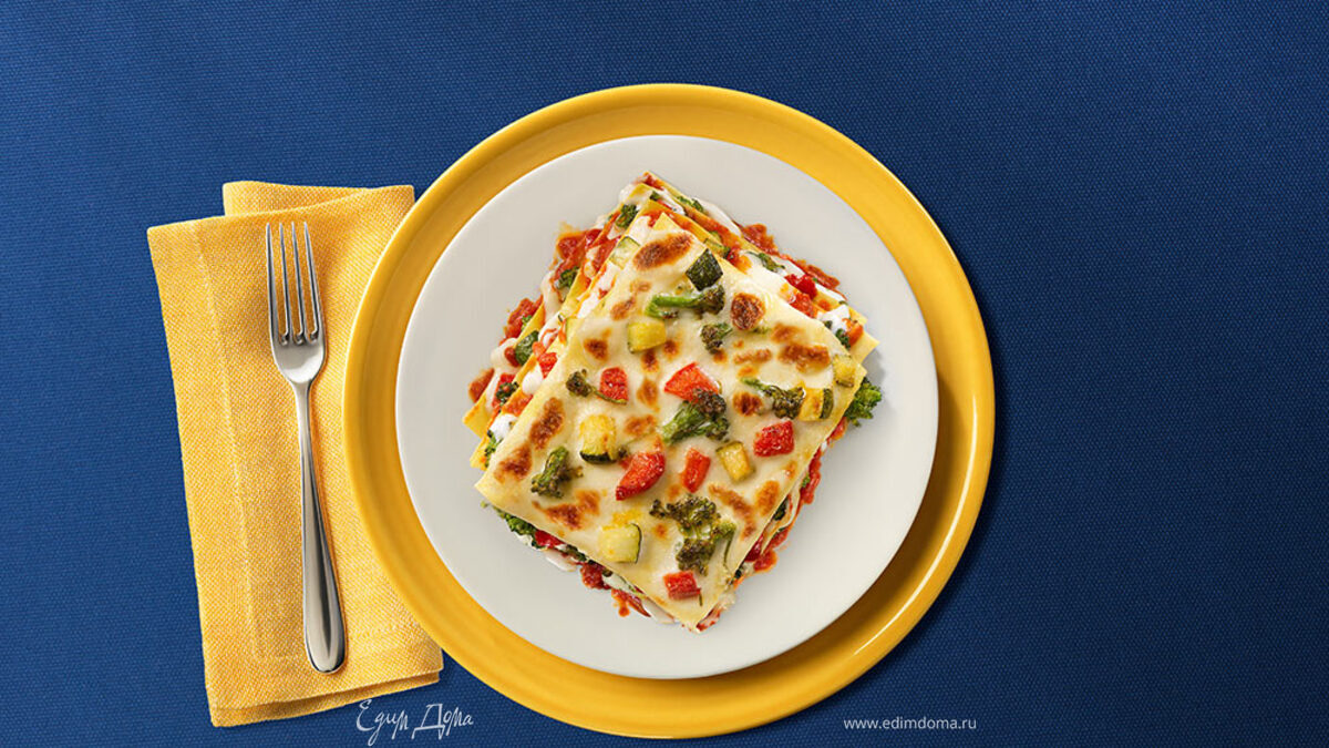 - Шаг 3Выложить на противень, чередуя: слой бешамель, два листа лазаньи, 1/5 обжаренных овощей, 1/5 томатного соуса Базилико Barilla, 1/5 натертого сыра. Повторить 5 раз.