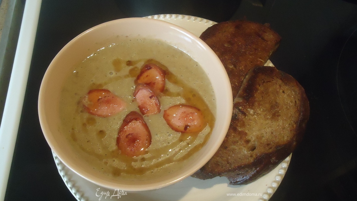 - Шаг 5Суп наливаем в чашку, сверху выкладываем жареные сосиски и поливаем тонкой струйкой оливковым маслом, а сбоку можно положить пару гренок.