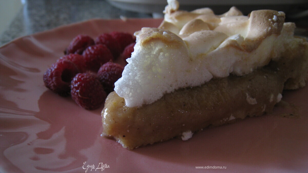 Достаем из духовки горячий пирог и украшаем меренгой. И ставим опять в духовку на 10 мин пока меренга немного подрумянится. Если у вас есть режим гриль, то можно использовать его, но для подрумянивания уйдет 2-3 мин. Я немного передержала. Хотя можно и не выпекать с меренгой. - Шаг 5