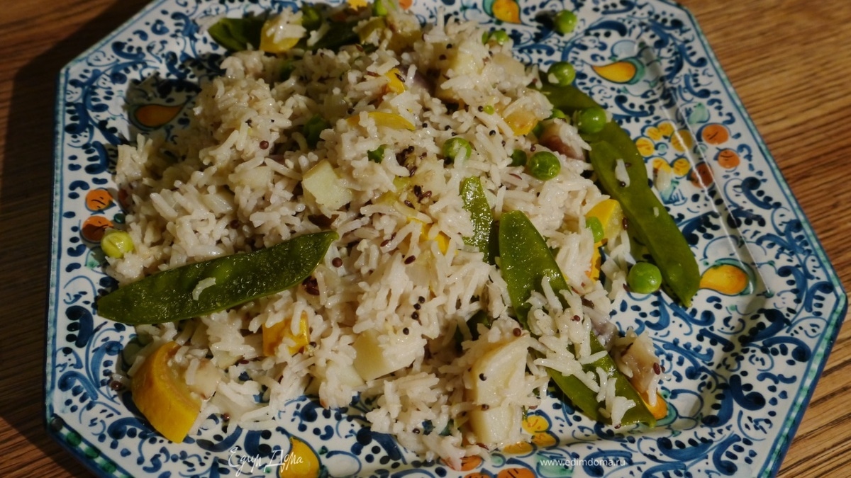 Добавить зеленый горошек и стручки молодого горошка, все перемешать, если необходимо, влить немного горячей воды и продолжить прогревать под крышкой еще около 5 минут, до готовности риса.