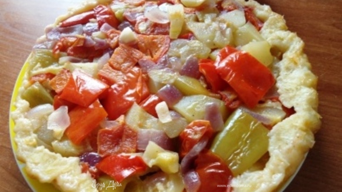 Слоеное тесто раскатать круглой лепешкой и накрыть овощи сверху, слегка подогнуть вовнутрь. Ставим в духовку и выпекаем около 25 минут. Тесто должно подрумяниться. - Шаг 5