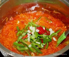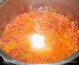 Добавить морковь, соль, сахар и готовить 25 мин.