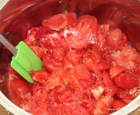 С помидоров снять кожицу, опустить в сотейник с раскаленным растительным маслом.