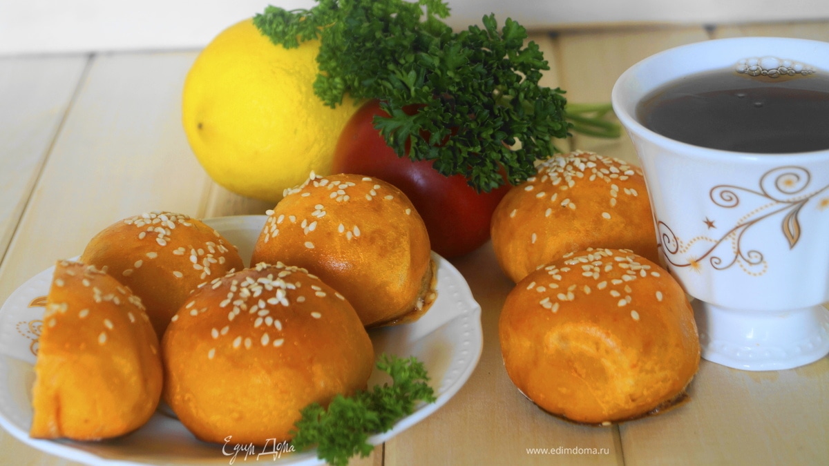 Выложить пирожки на противень застеленный бумагой для выпечки. Смазать пирожки смесью из взбитого яйца с молоком. Посыпать кунжутом. Выпекать в разогретой до 200 гр. духовке 15-20 минут. Подавать к столу в теплом виде. Приятного аппетита!
