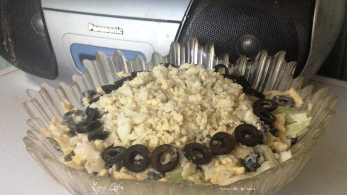 Оставшееся яйцо измельчить. Украсить салат яйцом и колечками маслин. Приятного аппетита!