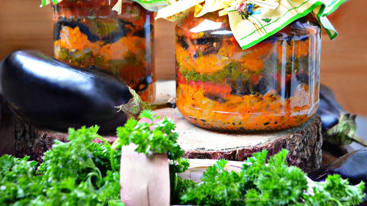 В стерилизованную банку на дно уложить слой моркови с луком, потом слой баклажанов и залить маринадом. Далее уложить слой из зелени с чесноком, снова лук с морковкой, баклажаны, маринад, зелень. И так до верха банки. Последний слой должен быть из маринада.