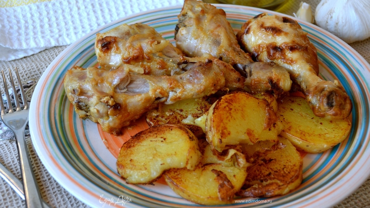 Подавать куриные ножки с гарниром из картофеля! Очень удобно, что и основное блюдо и гарнир к нему готовятся одновременно! :) Приятного аппетита!