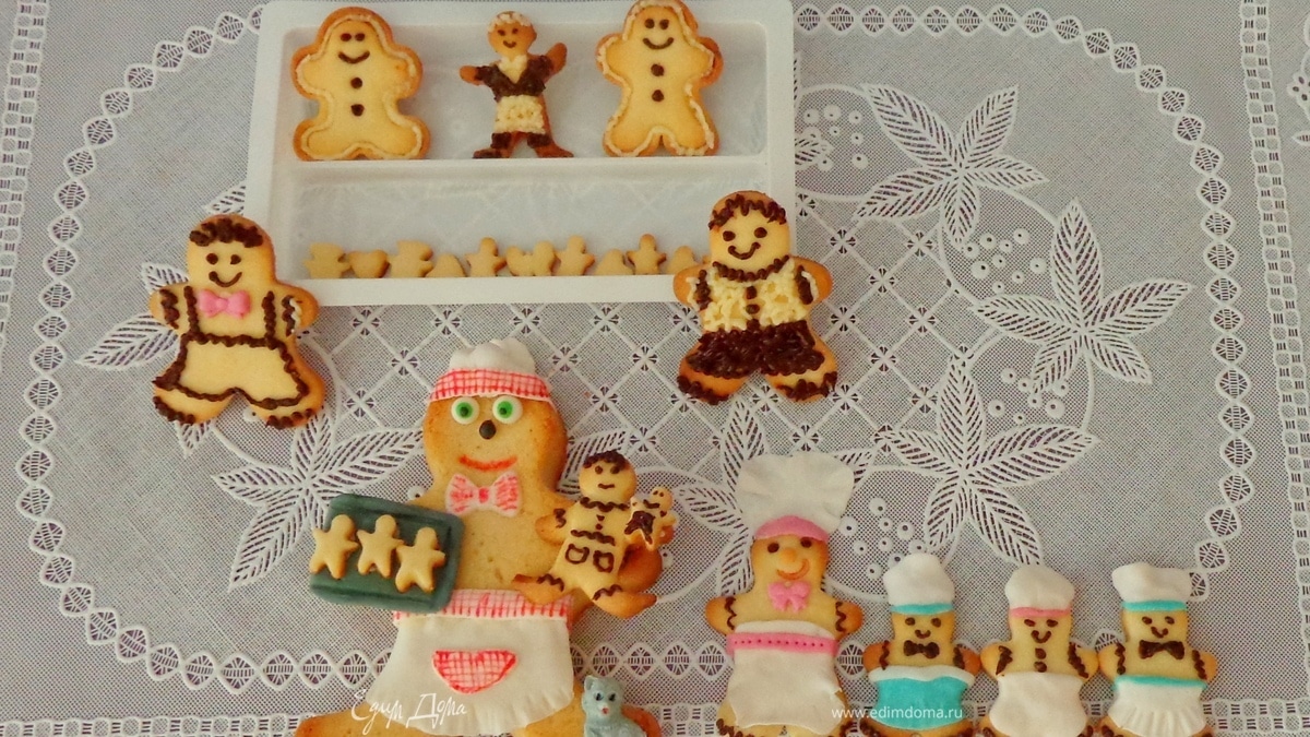Приготовить свое любимое песочное тесто. Я предпочитаю вот это: ссылка на рецепт Только для данного рецепта можно не использовать какао. Но, в принципе, почему бы и не поиграться с разными цветами. Тесто хорошо охладить, тогда оно будет чудесно держать форму и не будет расплываться. Вырезать формочками человечков. Выпекать при 180 градусах до легкой золотистости. Готовые изделия украсить растопленным шоколадом и мастикой. - Шаг 1