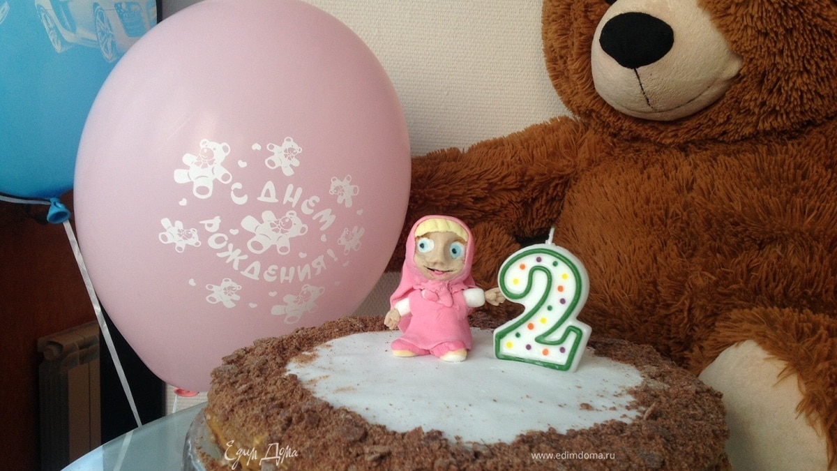 Скажу честно, самое сложное было украшение, это мой первый опыт работы с мастикой. Дело в том, что мой сын обожает мультик "Маша и Медведь", поэтому я решила приготовить Машу из мастики. Мастику делала сама: соединила сухие сливки, сгущенное молоко и сахарную пудру в равных пропорциях. Поскольку делала первый раз, то не фотографировала, кому интересно могу скинуть ссылку на МК.