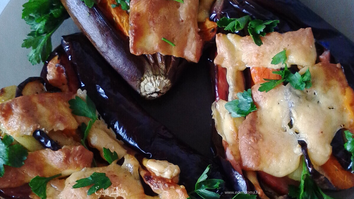 Замечательные веера! Баклажаны только выиграли от такой компании, да еще и сытные - с ветчиной!
