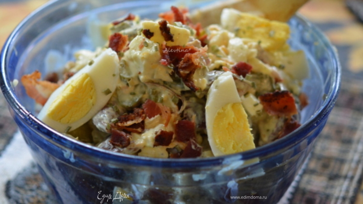 Сметану с майонезом смешать, добавить горчицу. Перемешать. Добавить в салат все перемешать, посыпать беконом и подавать тут же к столу. Приятного аппетита. Салат просто пальчики оближешь.