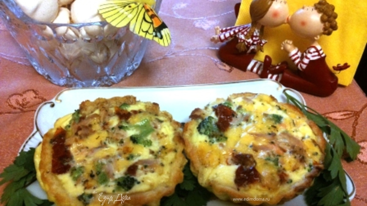 Тем временем готовим начинку. В оставшуюся молочно-яичную смесь добавляем мелко порезанные: брокколи, семгу, вяленые помидоры, размятый вилочкой тунец и порезанный мелким кубиком сыр. Хорошенько перемешиваем. - Шаг 2