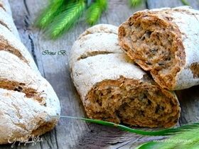 Хрустящий, ароматный пшенично-ржаной хлебушек с топенадой из оливок и зелени! Очень вкусно! Съели его еще тепленьким.