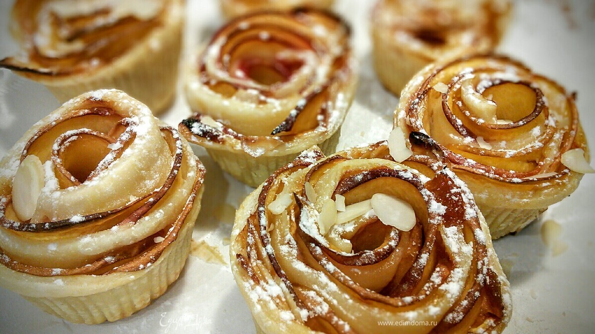 Пласт теста смазать абрикосовым джемом (вареньем, мармеладом), посыпать миндальными лепестками. Разрезать вдоль на полоски шириной около 3 см.