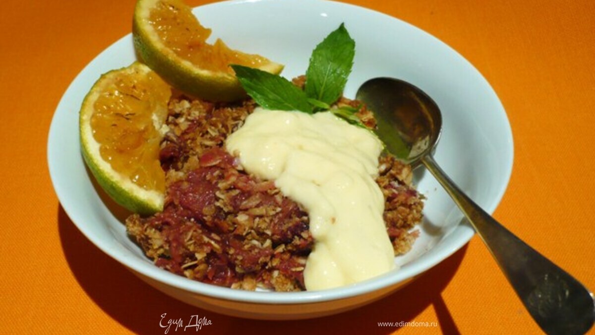 Засыпать смесью ревень. Поставить в предварительно нагретую до 180 С духовку на 40 минут. Подавать крамбл теплым или комнатной температуры, кто как любит. Хорош крамбл с готовым заварным кремом или сливками. В качестве украшения я добавила карамелизированные апельсины (на фото).