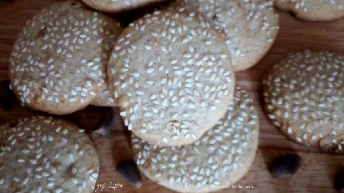 Разогреть духовку 180 гр. Обжарить кунжут. Достать тесто, нарезать на медальончики и обмакнуть верхнюю часть в кунжут. - Шаг 4