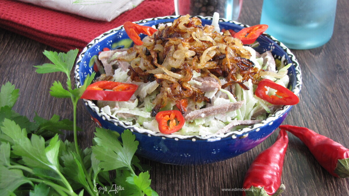 Салат выложить в салатник, сверху посыпать обжаренным луком.