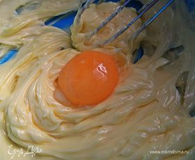 Отделяем желток от белка и кладём желток в масло. Опять растираем.