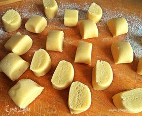 Из послушного теста лепим колбаску и делим на кусочки одинаковые как на ленивые вареники.
