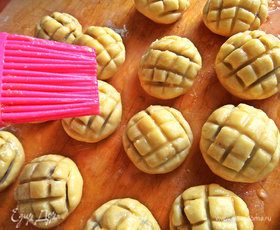 Слегка прижимаем шарик в виде пряничка и наносим сеточку. Можно тыльной стороной ножа, но я приноровилась сделать силиконовой лопаточкой для теста. Нажимаем не сильно, не повредив начинку.