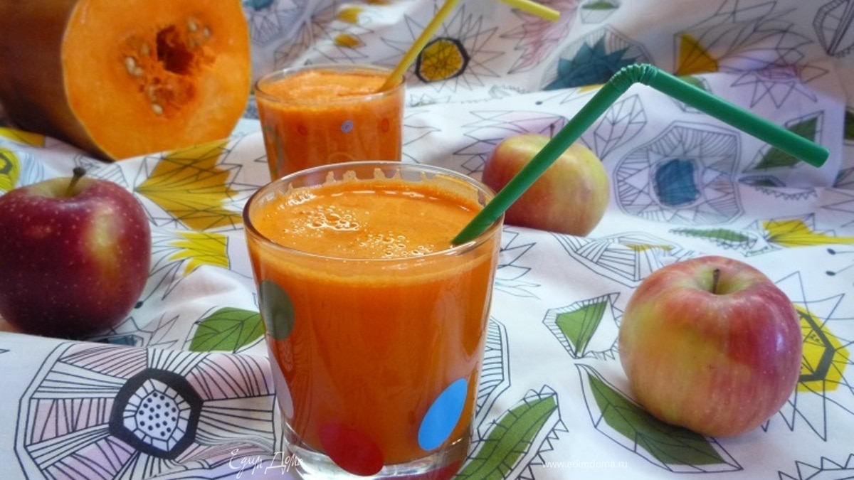 В результате смешивания соков удается получить очень вкусные и полезные коктейли, которые придутся по душе всем членам семьи!!! Приготовьте коктейль из осенних овощей и фруктов- тыквы, моркови и яблок, и ваш организм насытится витаминами и микроэлементами, а предстоящий день наполнится солнечными, яркими красками!!! О полезных качествах тыквы пожно написать целую книгу!!! Содержит витамин А (каротин), в тыкве много клетчатки, содержит витамин Т (улучшает обмен веществ и участвует в свертываемости крови), полезна для гипертоников. Морковь содержит каротин, витамин Е, фосфор, магний, прекрасно влияет на функционирование кишечника, снимает симптомы изжоги. В яблочном соке содержится витамин С, соли магния, фосфора, калия, железа, цинк, лимонная, яблочная и другие органические кислоты.