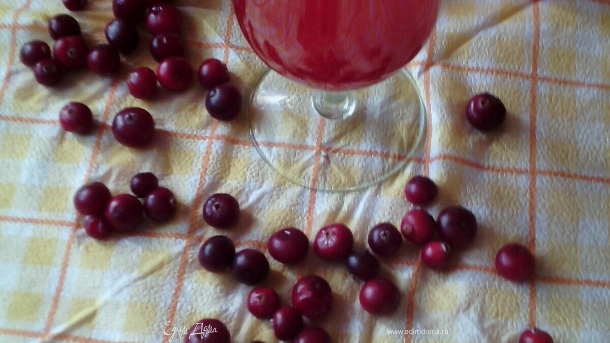 В мытую клюкву добавляем кипяток и оставляем на 1-2 минуты. Затем воду сливаем, в блендере размягчаем клюкву, пропускаем эту массу через сито. Образовалась густая однородная масса и добавляем 1 литр кипятка. - Шаг 1