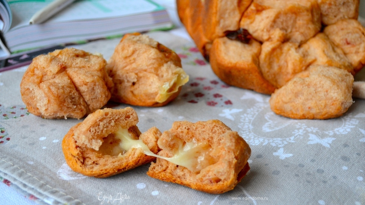 Булочки укладывать в ведерко - неплотно, чтобы им было куда увеличиваться и вырасти при расстойке. Между слоями булочек положить вяленые помидоры и несколько кубиков сыра. - Шаг 8