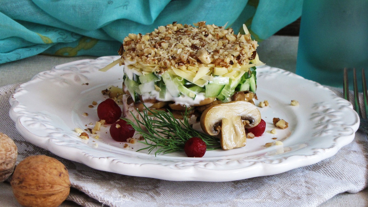 Давно не готовила салаты с майонезом. Что-то так захотелось. Вспомнила один салатик, который часто готовила в школьные годы. Салатик очень сытный — мясо, орешки, сыр, грибы, поэтому порции будем делать небольшими.