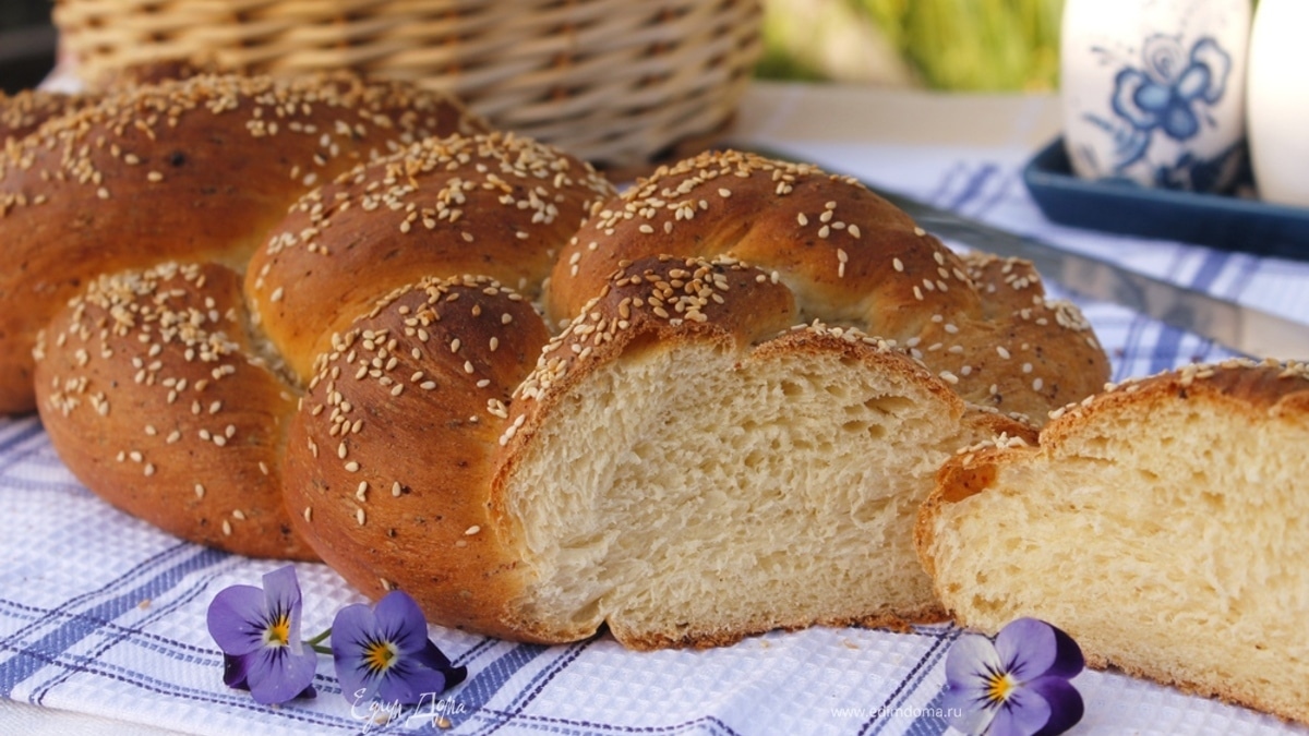 Через 30 минут плетенку смазать взбитым яйцом и присыпать кунжутом. Выпекать при температуре 190-200 градусов около 40 минут.