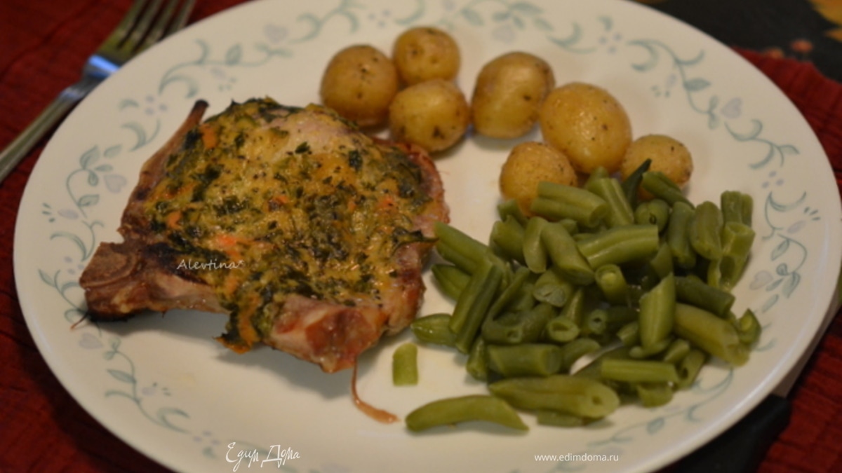 Выложить пряное масло поверх каждой свиной котлеты. Поставим в разогретую духовку на 180°C. Или используем режим бройл. Готовим примерно 45 мин. - Шаг 3