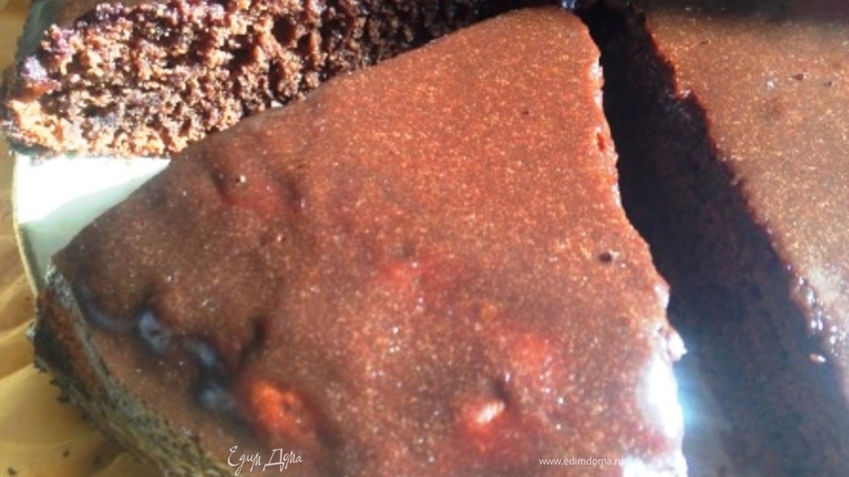 Вылить тесто в смазанную маслом форму 24 см и выпекать в разогретой до 180 духовке до готовности. Горячий пирог залить отложенной половиной шоколадной смеси.
