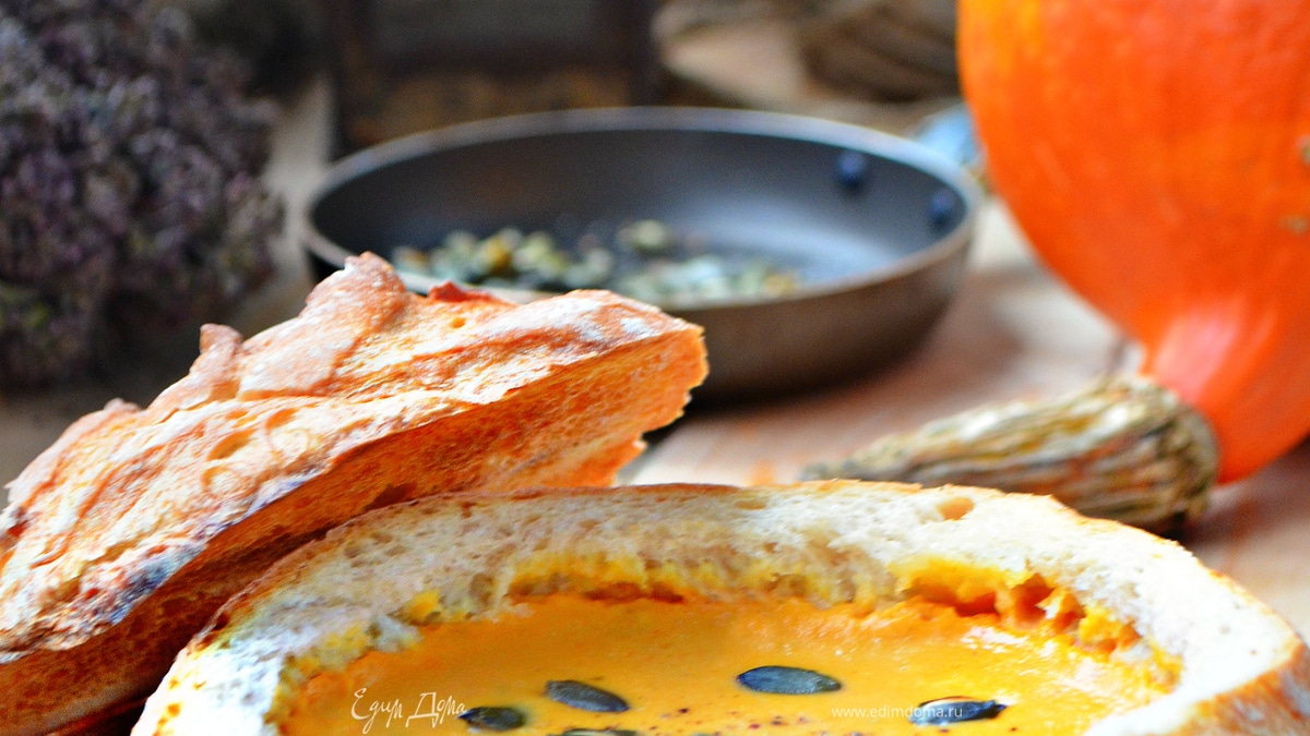 Дайте хлебной «тарелочке» слегка остыть, наполните тыквенным супом. - Шаг 10