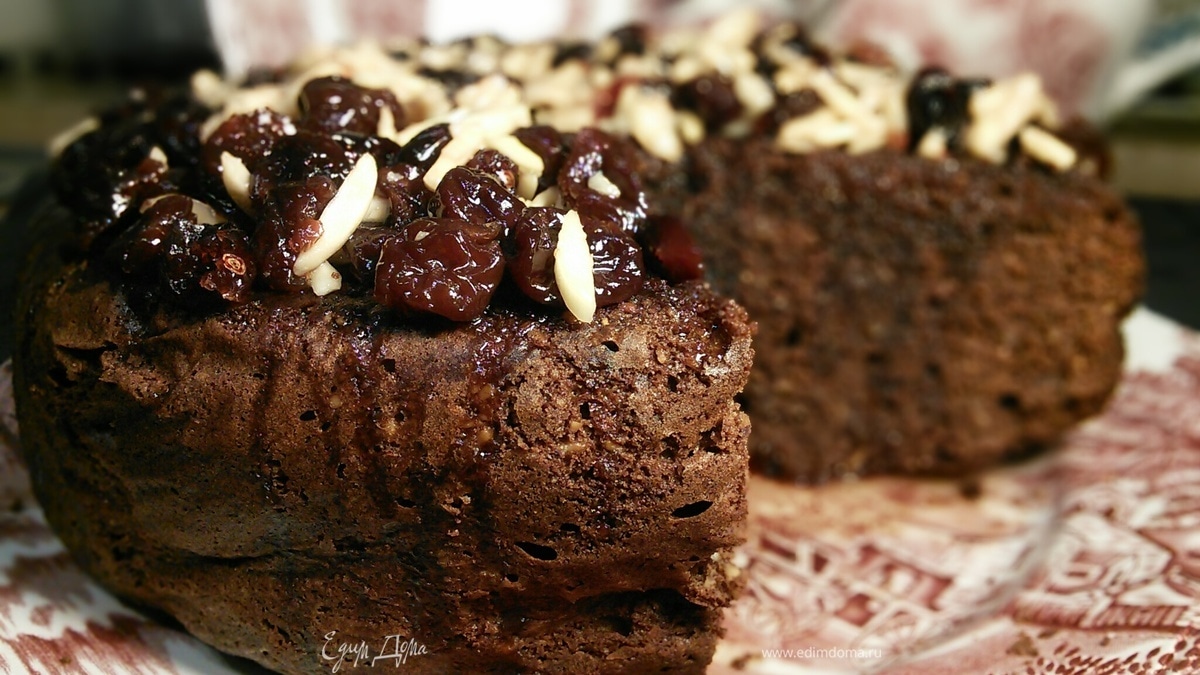 Длинной палочкой проколите дырочки и пропитайте глазурью весь торт. В конце выложите на торт вишню и миндаль.