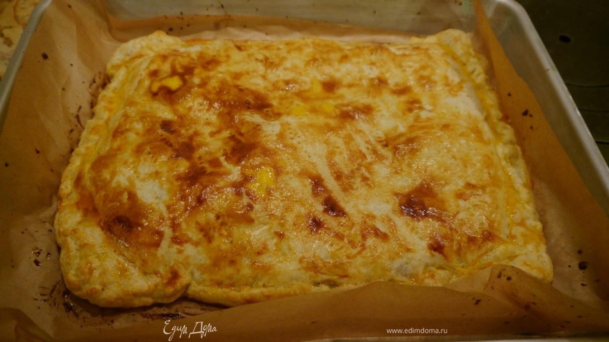 Глубокий противень выстелить бумагой для выпечки, выложить пласт теста, сверху, отступая от краев два сантиметра, равномерно разложить остывшую грибную начинку, накрыть вторым пластом и защипнуть края теста. - Шаг 16