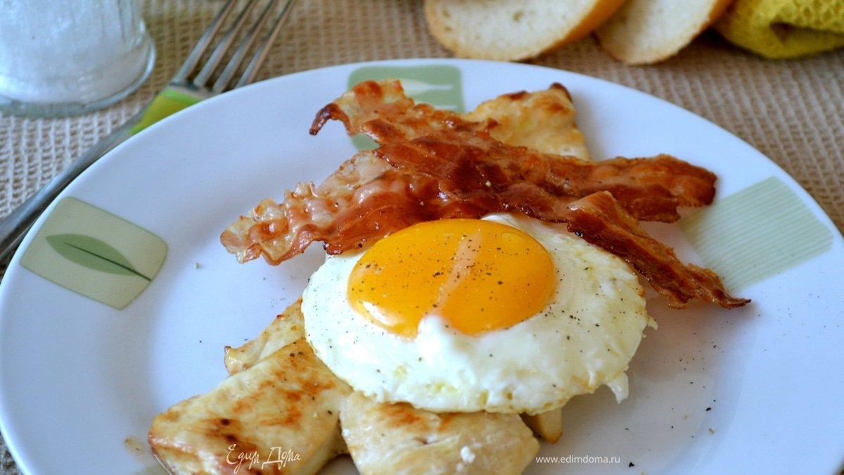 Тем временем в другой сковороде обжарить полосочки бекона. Выложить на салфетку. - Шаг 5