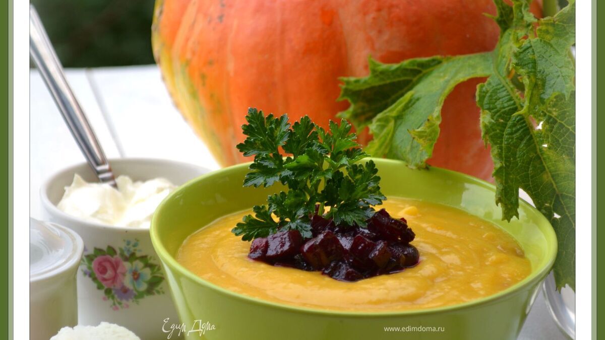 Тыквенный суп-пюре с карамелизованной свеклой и золотистым луком