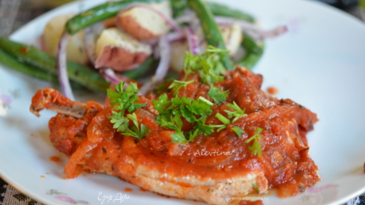 Подаем свинину к столу с готовым гарниром, полив томатным соусом. Посыпать сверху зеленью. Приятного аппетита!