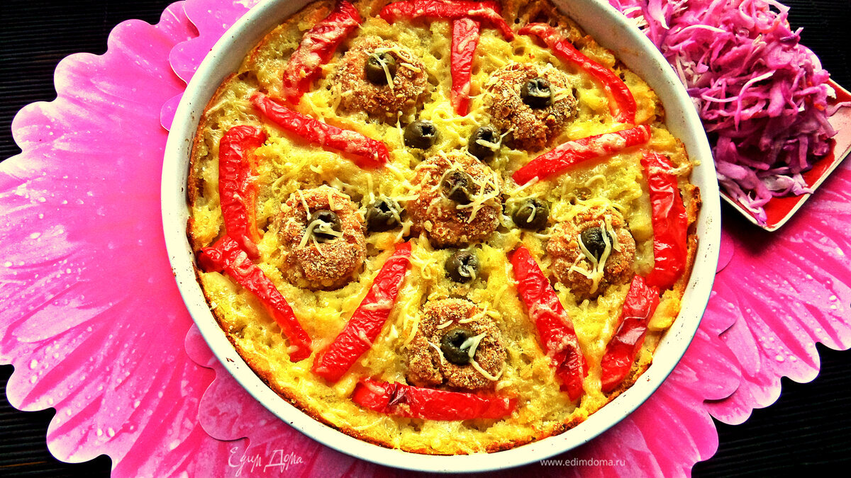 Форму (25 см в диаметре) смазываем оливковым маслом, выкладываем всё пюре и сверху втыкаем наполовину котлетки, предварительно обваляв их в сухарях. - Шаг 5